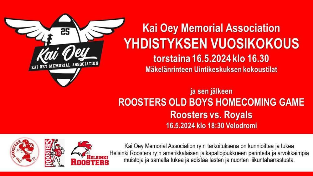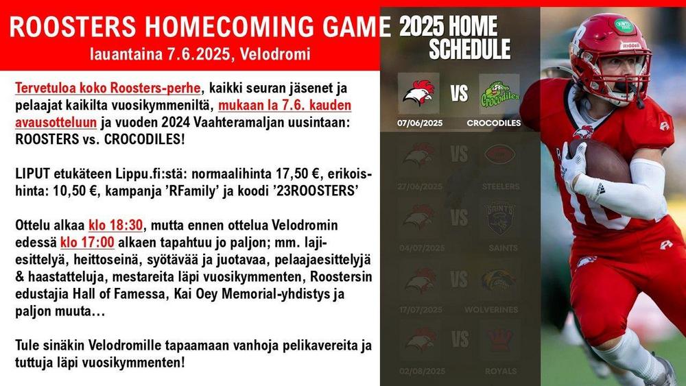 16.5. Roosters Homecoming Game on Roostersin kauden 2024 avauspeli Roosters vs. Royals. Merkkaa kalenteriin!